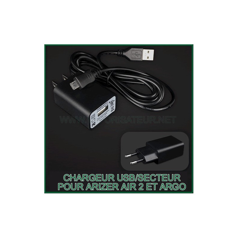 Pour brancher sur une prise secteur électrique fixe directement et bénéficier ainsi d'une durée de recharge plus courte de la pile de votre vaporisateur portable Arizer Air 2 ou Argo il vous suffira donc de remettre le petit boitier adaptateur USB/secteur électrique et le tour est joué !