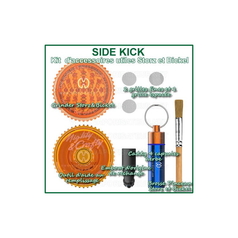 Side Kit est un set d'accessoires utiles pour vaporisateurs portables Mighty et Crafty ou Crafty+ concocté par leur fabricant Storz et Bickel. Le Side Kit est composé d'un Caddy avec 4 capsules, d'un grinder Volcano, d'un Outil d'aide au remplissage, de 2 grilles fines, 1 grille espacée, un embout et une brosse.
