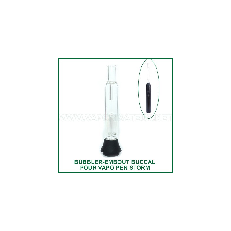 C'est un véritable plaisir de vous présenter cette pièce en verre très originale fabriquée sur mesure pour vapo pen Storm. Il s'agit d'un embout buccal allongé qui est en même temps une véritable water pipe en taille mini car il possède un mini percolateur capable de créer plein de petites bulles de filtration de vapeur, une fois qu'il est rempli d'eau bien sûr.