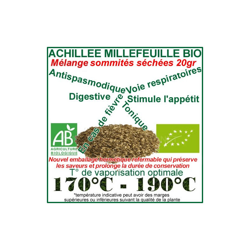 Achillée Millefeuille Bio - un sachet de 20gr composé d'un mélange de fleurs et feuilles séchées de qualité extra avec une garantie du produit issu d'agriculture biologique. Millefeuille est antispasmodique, digestive, tonifiante, cicatrisante... En vaporisation cette herbe médicinale bio libérera toutes ses substances actives.