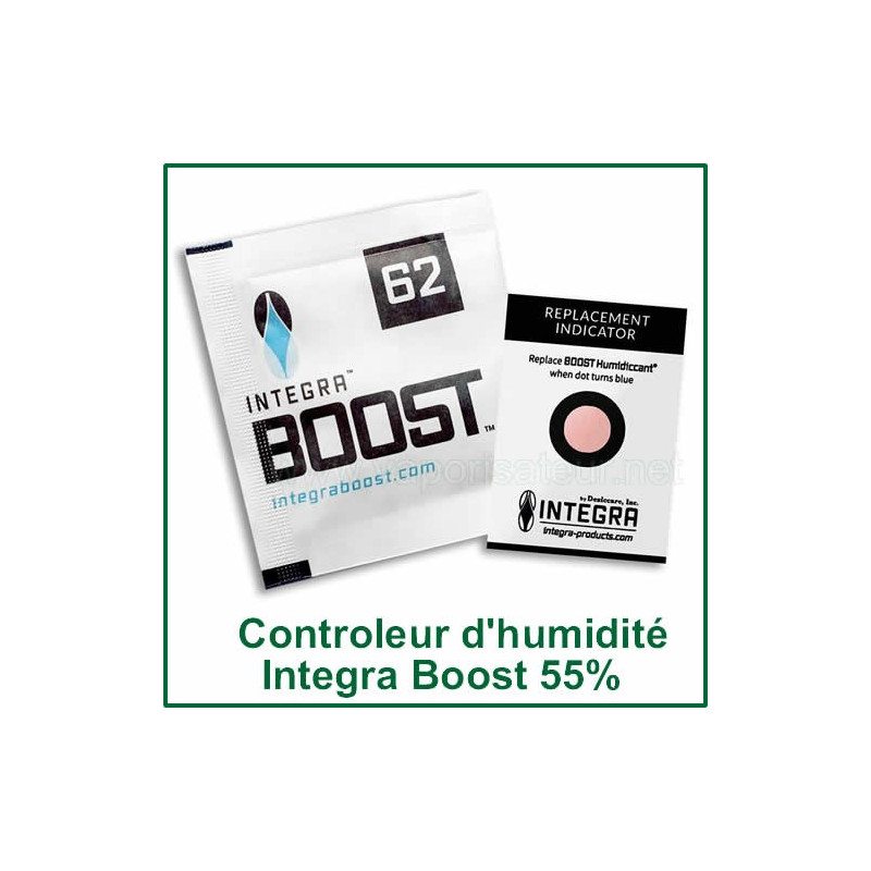Les sachets Integra Boost agissent ainsi en régulateurs du taux d'humidité avec une action dans les deux sens suivant les besoins, à savoir si l'air est trop sec les sachets BOOST rajoutent l'humidité et si le milieu est trop humide les sachets contrôleurs d'humidité Integra vont absorber le surplus d'eau dans l'air afin d'équilibrer au mieux l'hygrométrie ambiante(dans le cas de cette variété le taux sera stabilisé à 62% ce qui est la limite haute de la fourchette d'humidité idéale qui doit osciller entre le 55% et 62%.) Il existe un autre type de sachet dans la gamme Integra qui permet de stabiliser le taux d'humidité à 55% ce qui est le niveau le plus bas de cette zone de confort, à vous de choisir votre préférence.